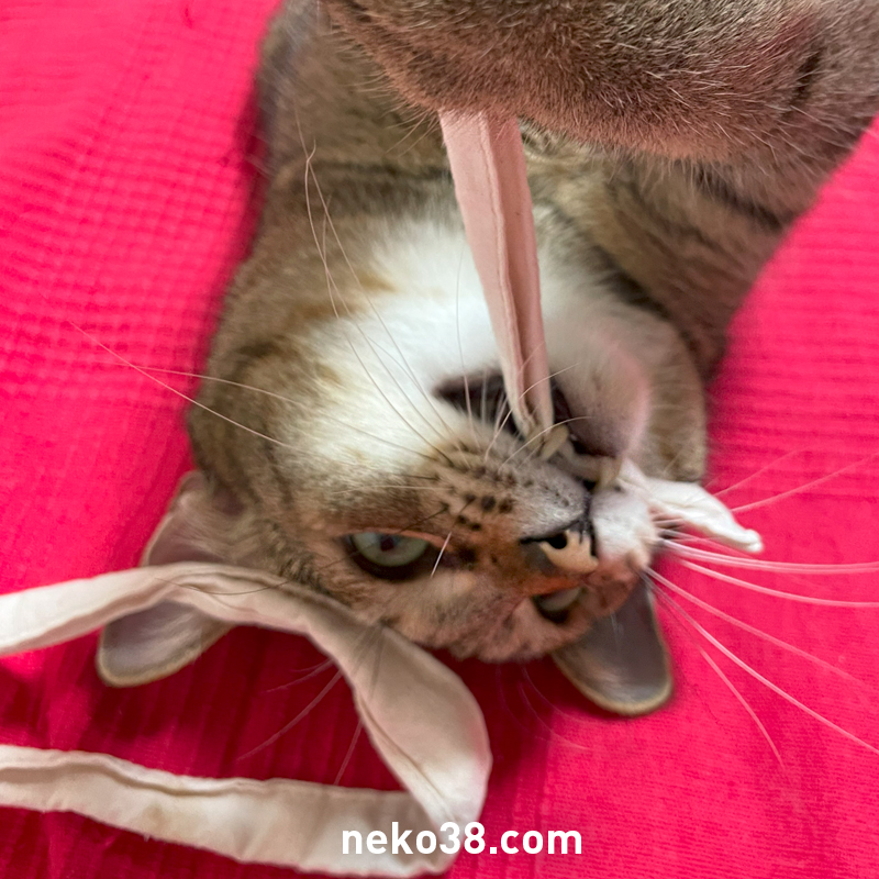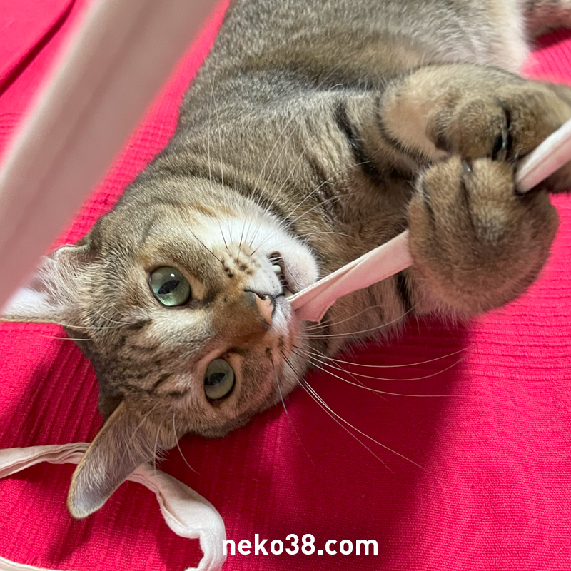 きじおは細長いものに目がないのである。ねこは全般的に紐好きであると思うが、それにしても執着がかなり強い。絶対に自分のものにしたいし、離したくない。