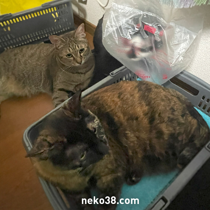 ねこさんの洗濯かごの周りに集結するメンバーたち
