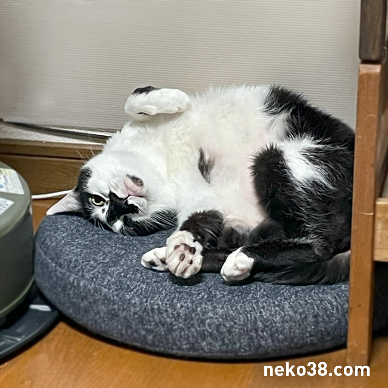 ストーブ前の一等地で変な寝方のはちこちゃん