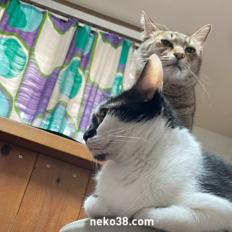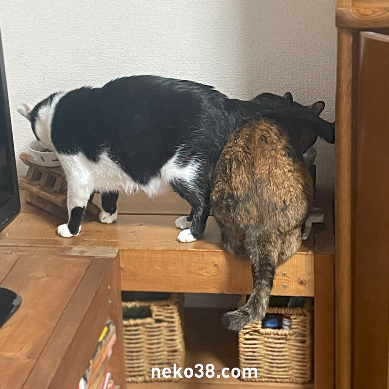 ねこさん、はちこちゃんにお尻をなすられながらの摂餌