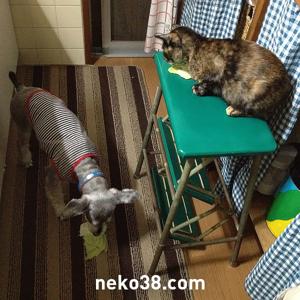 キャベツの葉をやるとねこさんまで食べ始めた。