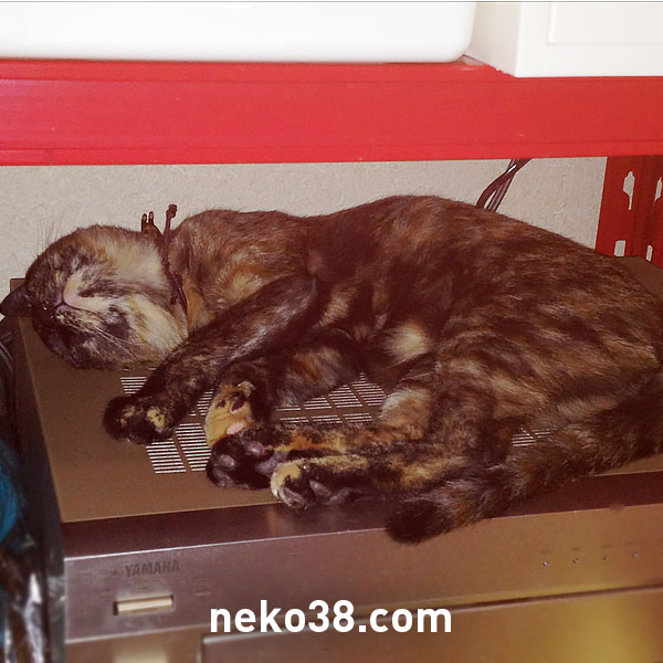よく伸びるねこさんは好きなときに好きな所で寝ている。
