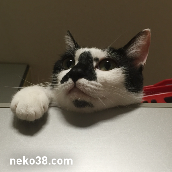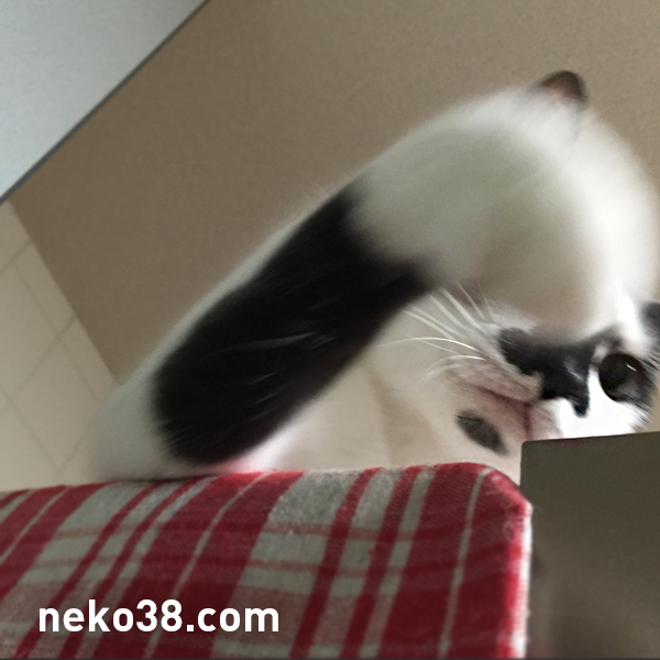 冷蔵庫の上から獲物を狙うはちこちゃん。