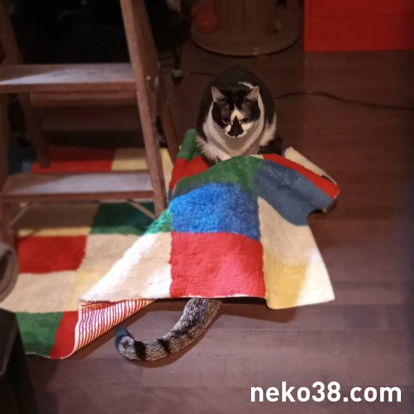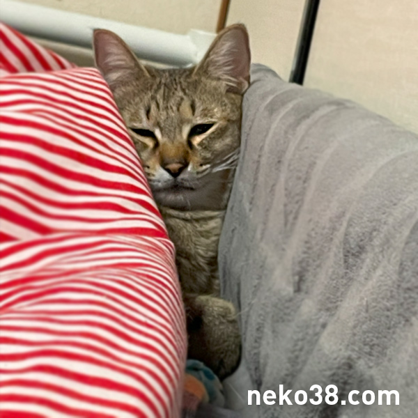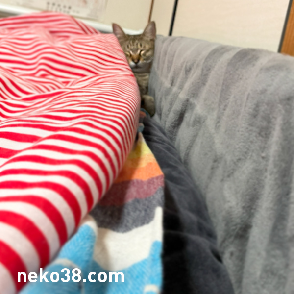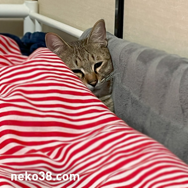 ベッドに埋まっているねこさん。