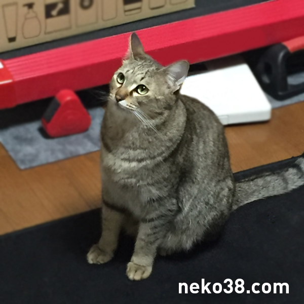 冷蔵庫の上のはちこちゃんに憧れるきじお。