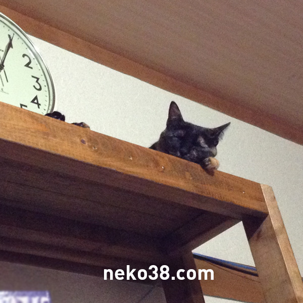 冷蔵庫の上で階段状になったり、棚の上で昼寝をキメるねこさん。