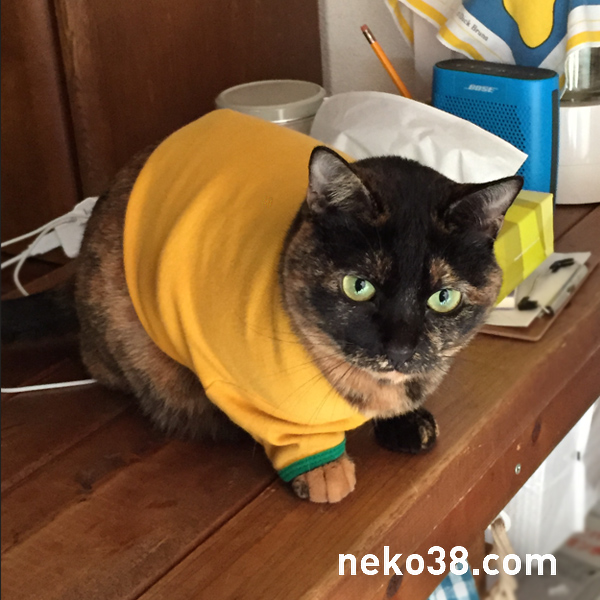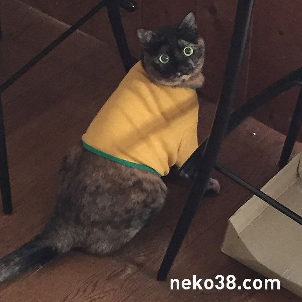 ねこさんに着せてみたが、アメリカの人みたいである。