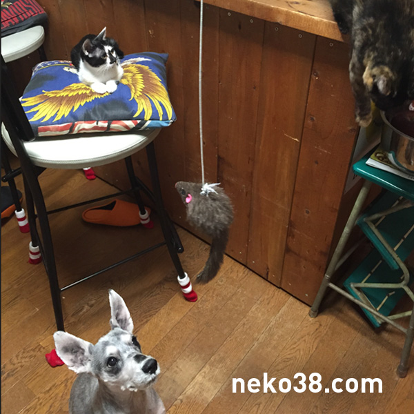 でかいねずみのおもちゃで3匹のコミュニケーションを取る場にする。