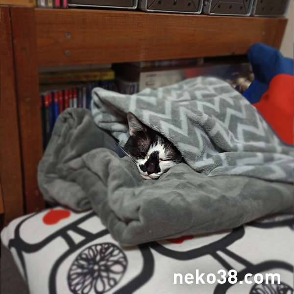 挟まれると落ち着くはちこちゃん。