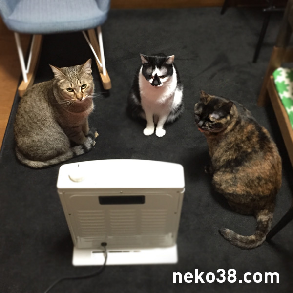 寒いので電気ヒーターを出すとたちまち人気スポットに。