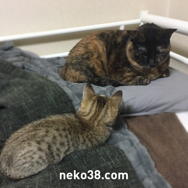 存在が気になってきたらしく、ねこさんを観察するきじお。