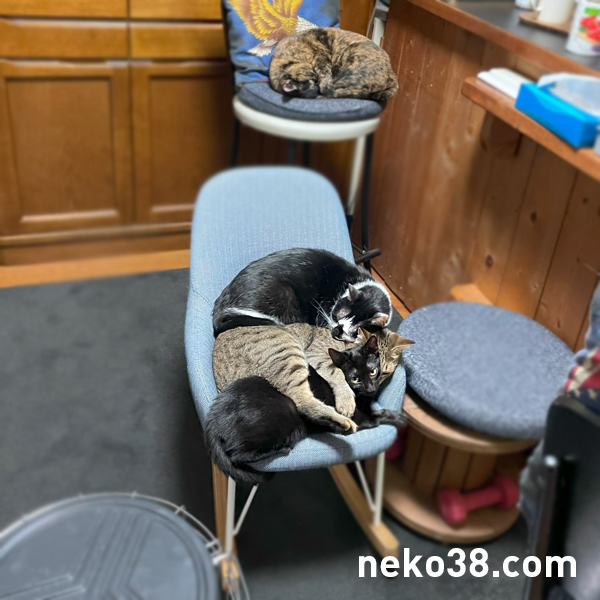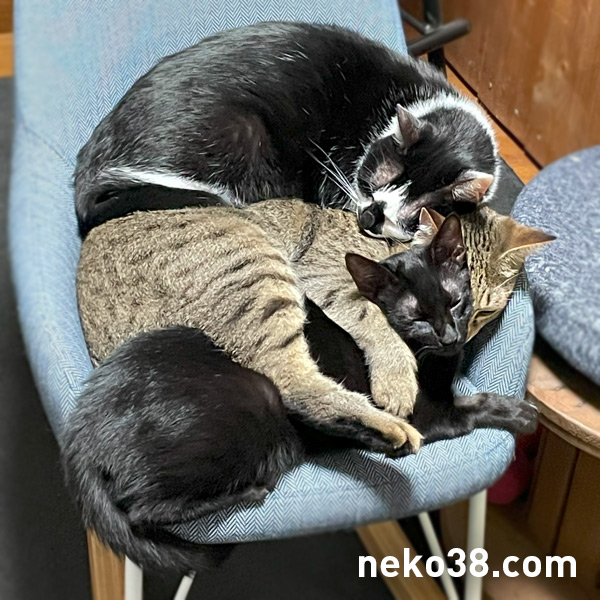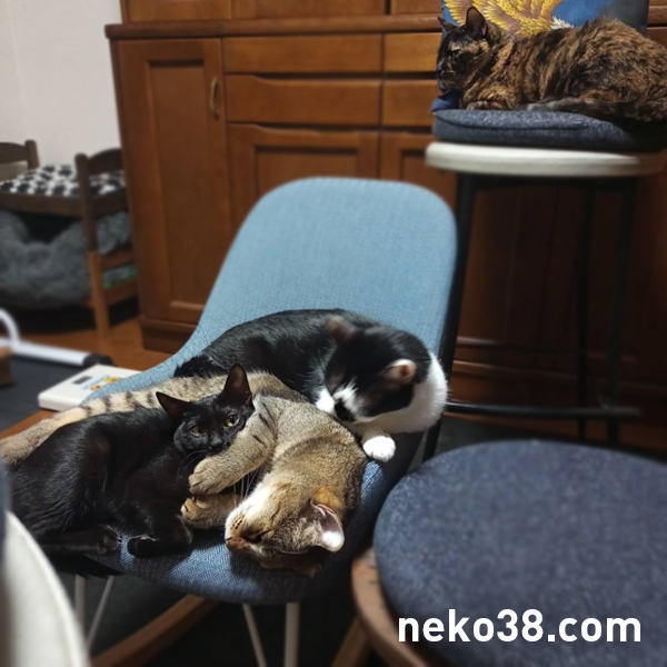 小さい椅子に3体が団子になっている。